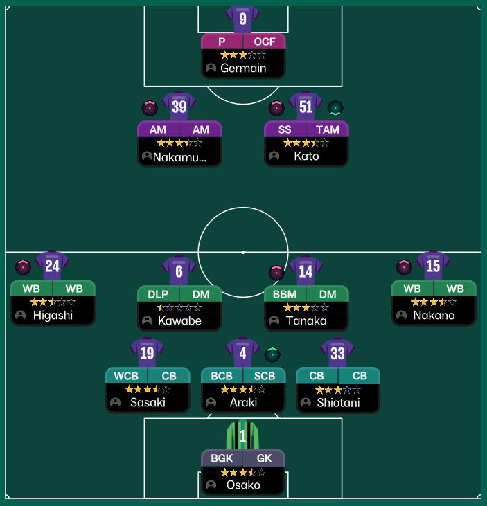 I have set the team up in a 3-4-2-1 structure - I have opted for this shape as it naturally divides the field up into specialised zones which I believe support the Game Model.